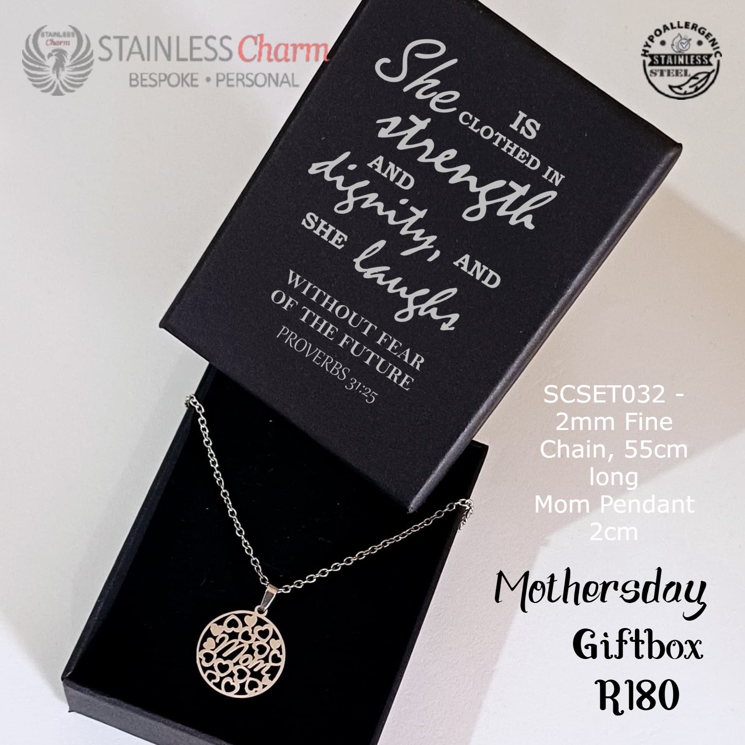 โจ Presented in a sleek black gift box with branding for “Stainless Charm Bespoke Personal”