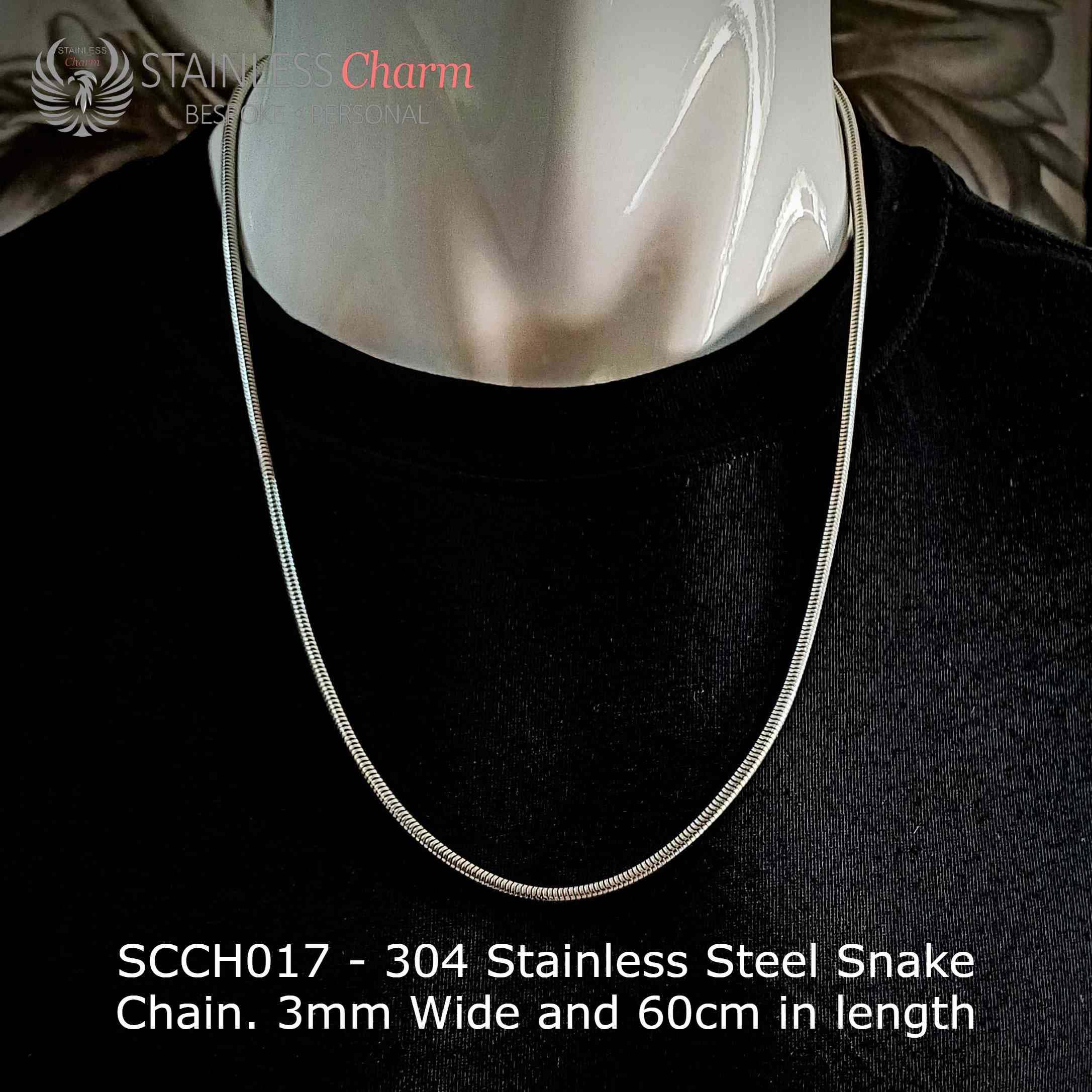 304 Stainless Steel Round Snake Chain. 3mm Wide and 60cm in length (SKU: SCCH017)